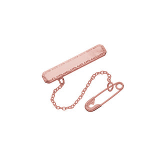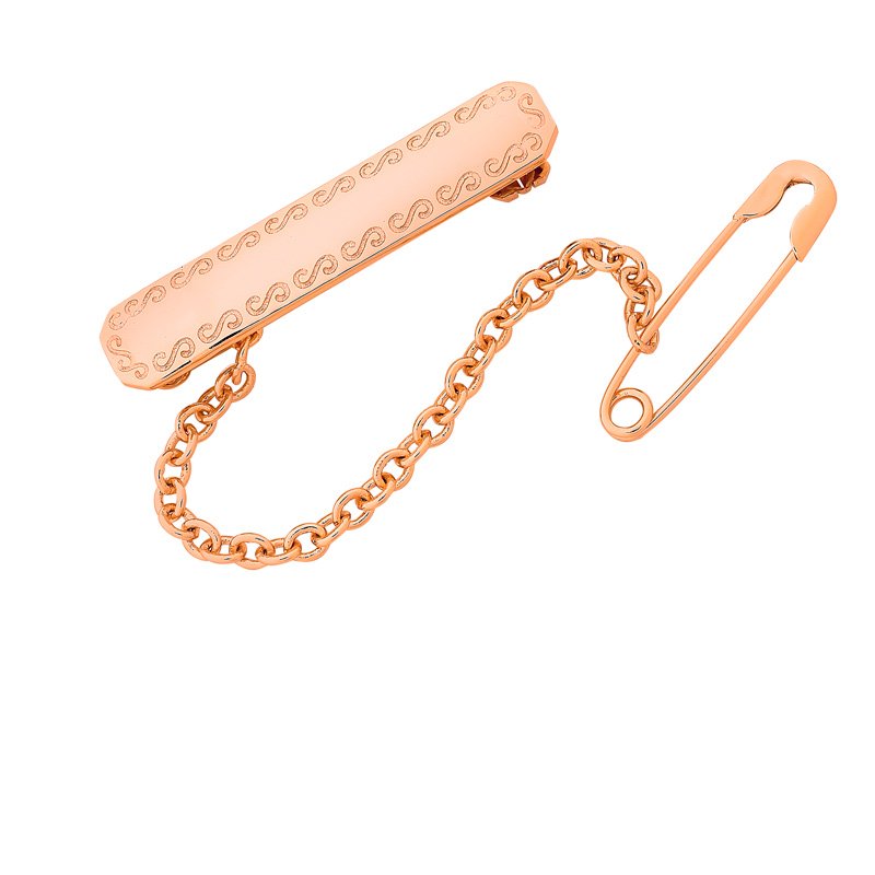 This Rectangular Baby Brooch has been crafted in Sterling Silver and has been Hard Gold Plated with Rose Gold and features a Rose Gold Plated Safety Pin & Chain. The brooch features an engraved pattern on the edge.