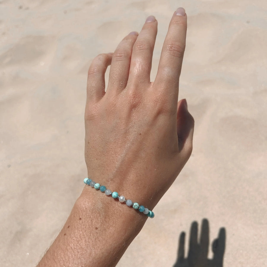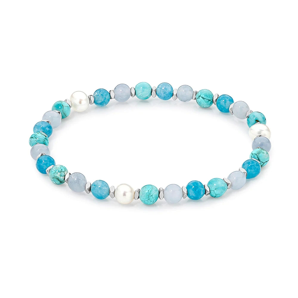 Designed with a mix of soft blue howlite, shimmering quartz, and luminous freshwater pearls, the bracelet balances playful tones with elegant charm. Its elastic petite 17cm design ensures a lightweight, comfortable fit, making it easy to slip on and perfect for all-day wear.