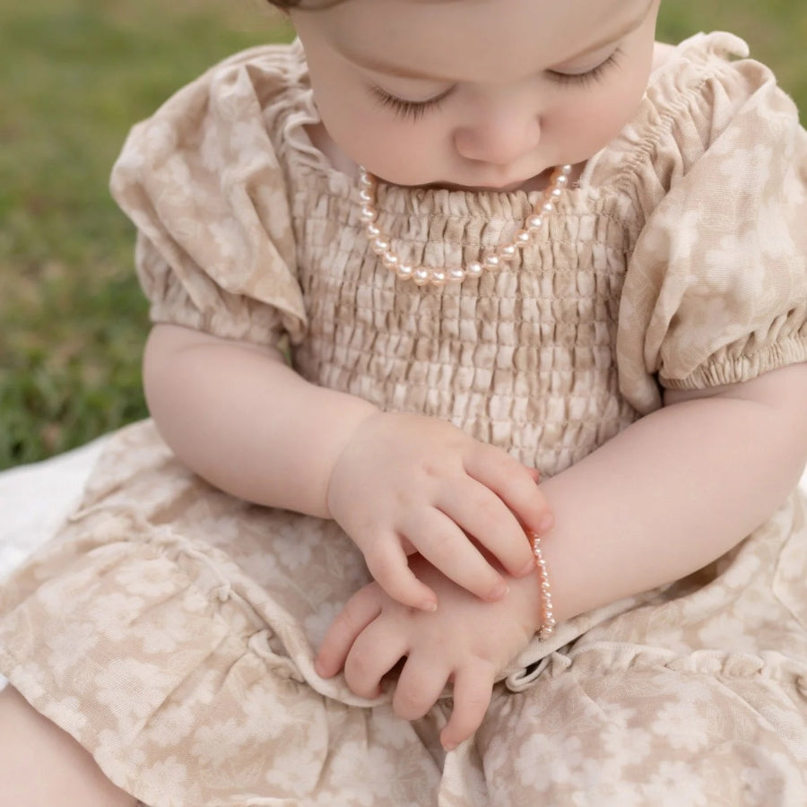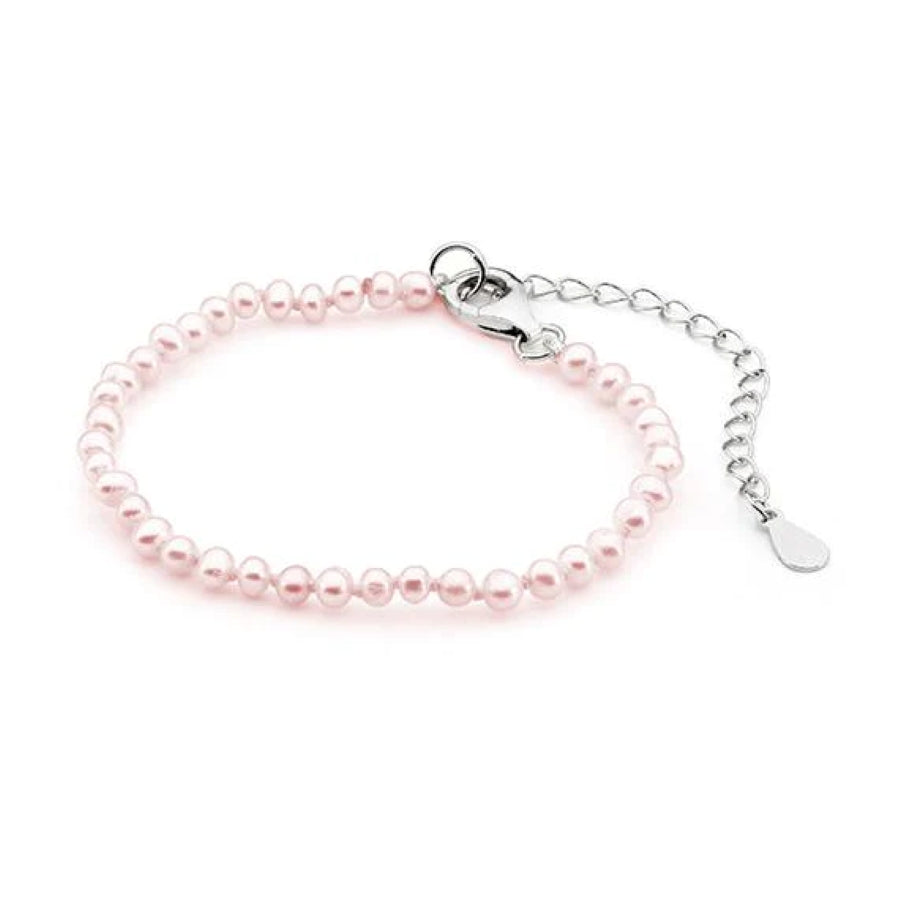 Crafted with delicate 3–3.5mm pink freshwater cultured pearls, each bead is individually knotted for both style and comfort. The bracelet is finished with a sterling silver lobster clasp and a 3cm extension chain, allowing the perfect fit as your little one grows from newborn up to 18 months.