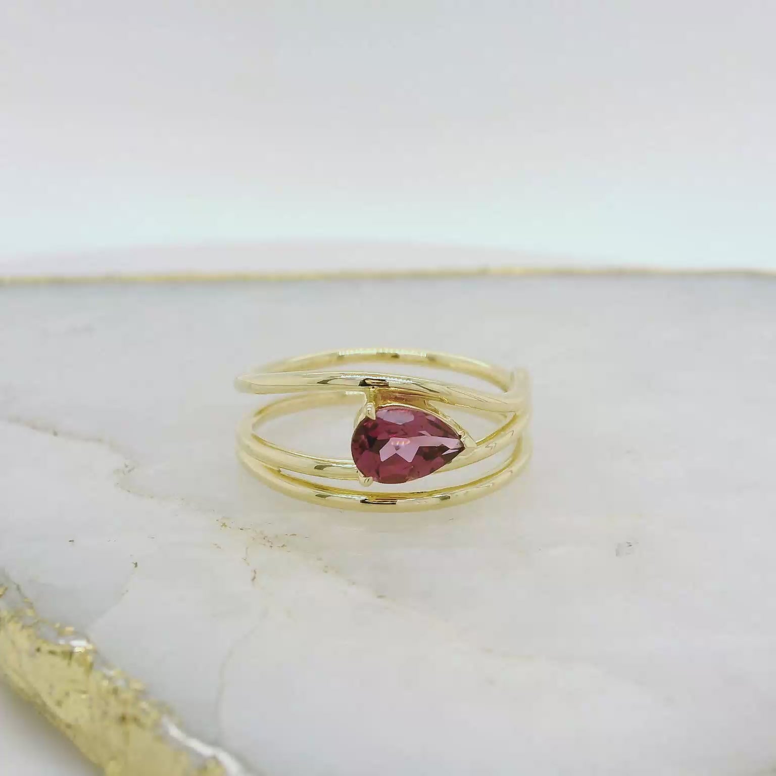 Make a statement with this 9ct yellow gold 3-row dress ring featuring a vibrant pear-shaped rhodolite garnet. Elegant, bold & perfect for gifting.