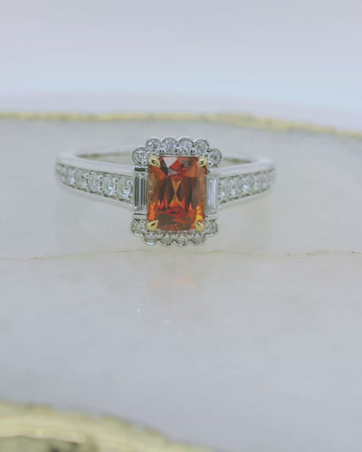 Vintage Inspired 18ct White Gold Orange Sapphire & Diamond Ring.