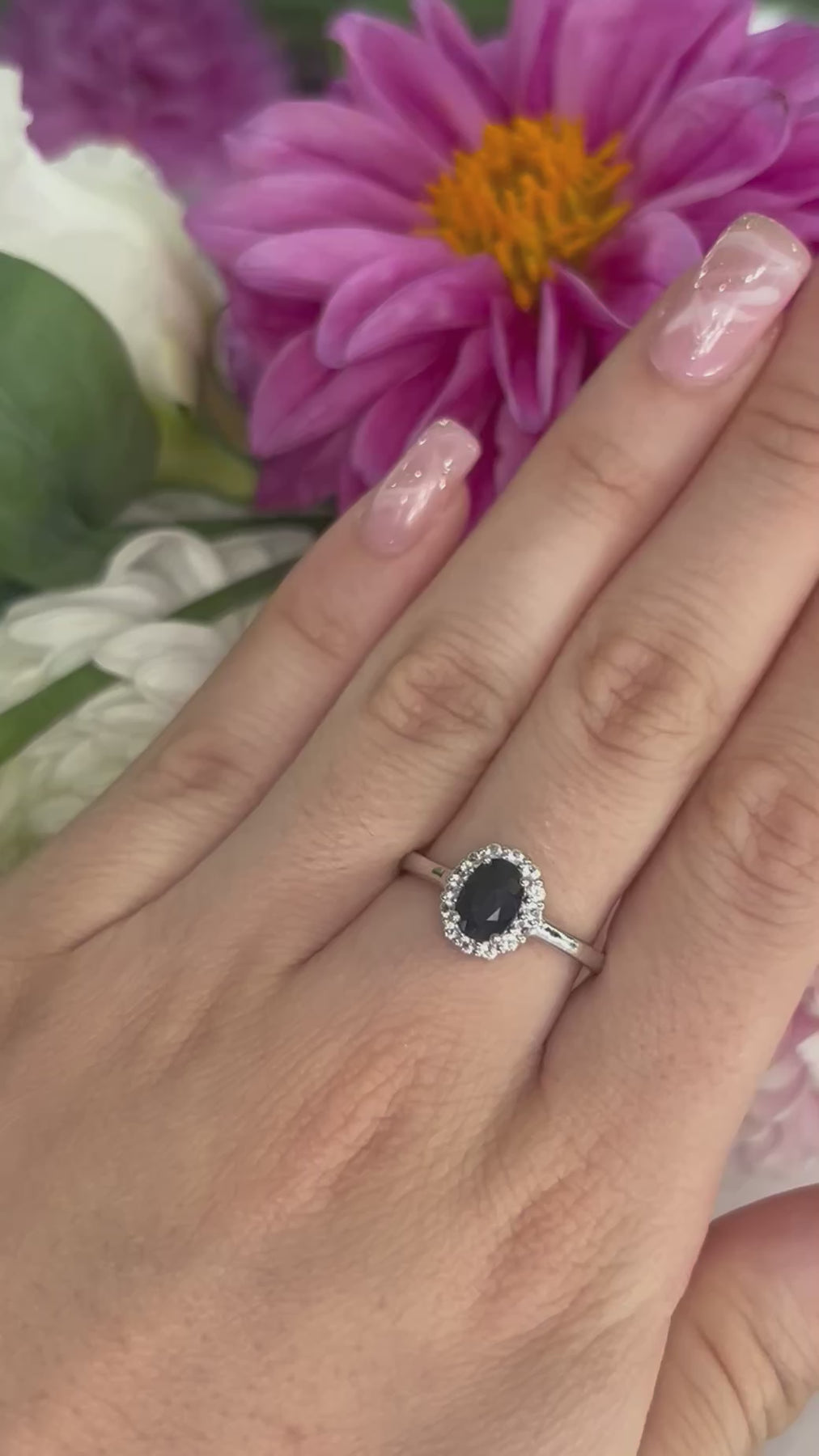A timeless icon, reimagined. This breathtaking ring features a deep blue/black oval-cut natural sapphire, encircled by a glittering halo of white topaz stones—all set in polished sterling silver. The halo design is famously reminiscent of Princess Diana’s engagement ring, making this piece a romantic nod to classic royal style.