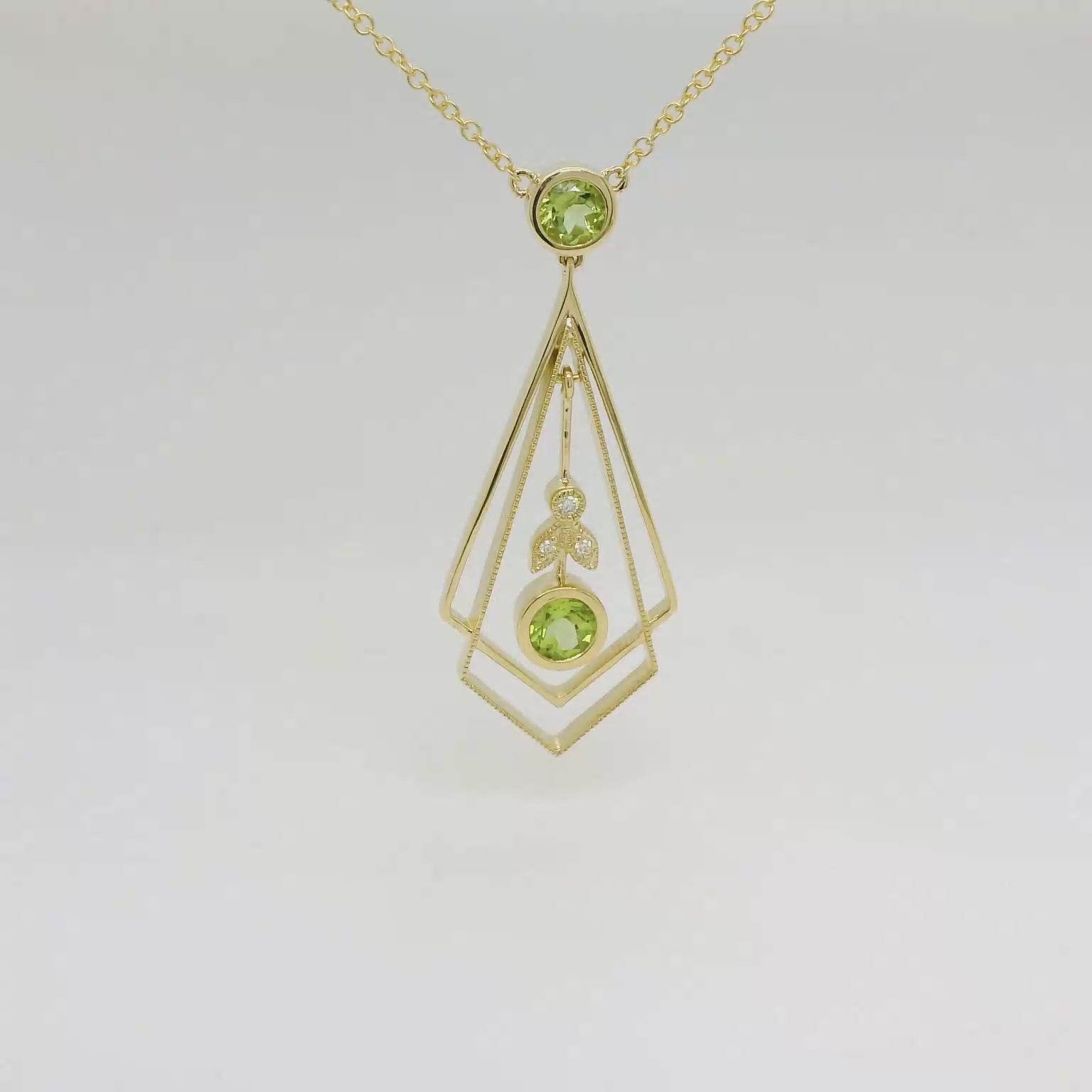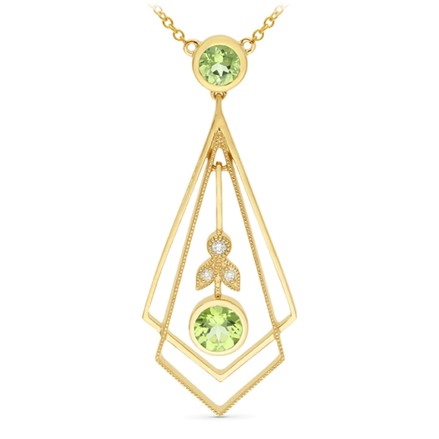 Capture the essence of graceful elegance and artisanal craftsmanship with our stunning 9ct Yellow Gold Peridot and Diamond Kite Pendant. Beautifully designed with intricate openwork detailing, this pendant gracefully showcases two vibrant, bezel-set Peridot gemstones—a radiant 5.0mm (0.53ct) round stone placed delicately at the centre, accompanied by a captivating 4.5mm (0.38ct) Peridot set within the intricate kite-shaped framework.