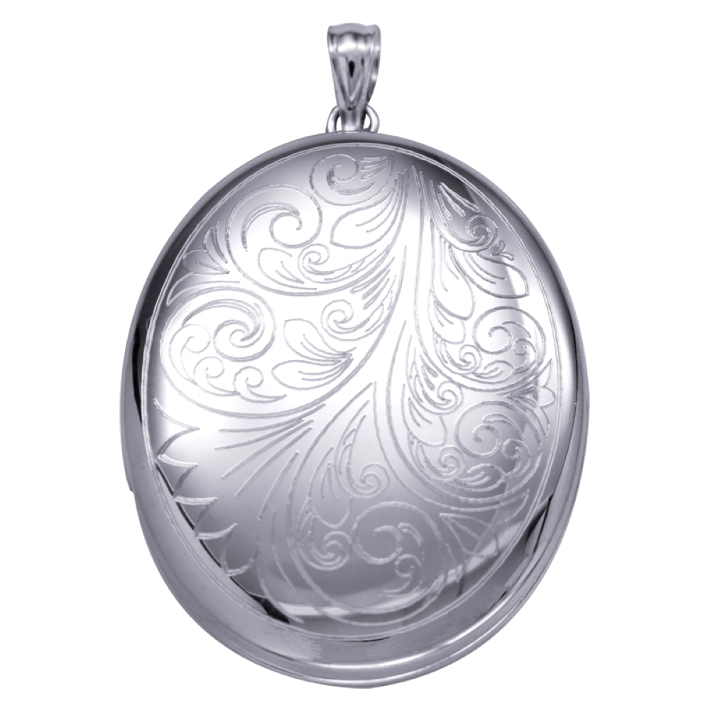 Measuring 34mm x 28mm, the locket features an elegant engraved scroll pattern on the front, giving it a timeless, vintage-inspired charm. The hinged design opens to reveal two oval compartments – perfect for holding cherished photos or small keepsakes.